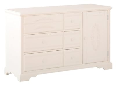 201-88 Features: -Simply elegant with is gorgeous scalloped edge details.-Ample storage to organize your child's necessities.-Made of solid hardwoods and wood.-Traditional center wood drawer glides.-Option to add matching hutch.-Combo Unit. Construction: -Drawers are box construction. Color/Finish: -Finish: Antique White. Specifications: -6 Drawers and a shelved side cabinet.