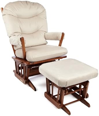 This Two Post glider and ottoman combo offers an exceptionally smooth and extra long glide motion with thick cushions and padded arms. It will be the perfect addition to your child's nursery or living room. There are no sharp edges, the finish is toxic free and this product meets all safety standards.Easy care microfiber fabricMultiposition mechanism allows to stop the glider at the desired positionHardwood frame construction in Harvest finishtop quality sealed ball bearingsRemovable foam cushions and padded armsAssembly Required Light AssemblyFabric MicrofiberFinish Medium WoodMaterial WoodColor Beige